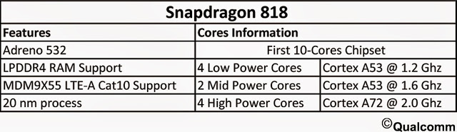 Dopo l'Helio X20 di MediaTek è il momento del Qualcomm Sanpdragon 818, il primo Soc deca-core della casa statunitense. Per ora non ci sono notizie ufficiali ne smentite da parte di Qualcomm. Le caratteristiche principali del nuovo Soc sono illustrate in figura.